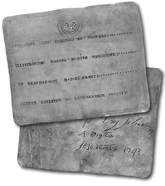 La Vérendryes were here. In early 1913, a lead tablet was discovered on the banks of the Missouri River near Pierre, South Dakota. Its Latin inscriptions read on front: “In the twenty-sixth year of the reign of Louis XV, in the name of the King, our thrice illustrious Sovereign, and for Monsieur the Marquis de Beauharnois, Peter Walter de Laverendrye placed (this tablet) 1741” and hand-carved in the back: “Deposited by the Chevalier de la Verandrye, Witnesses, St. Louis de la Londette, A. Miotte, March 30, 1743” (Manitoba Free Press, 12 April 1913).