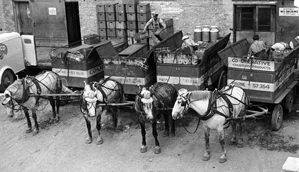 Horses decked out in their millinery apparel wait at the loading dock of the Peoples Co-operative to begin morning deliveries of dairy products, circa 1938.