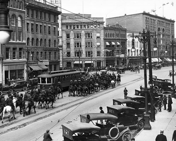 On 21 June 1919, mounted policemen approach the corner of Portage Avenue and Main Street. The first troop is in traditional stetsons and scarlet while the second still wears the khaki in which it had recently returned from overseas service with the Canadian Expeditionary Force.