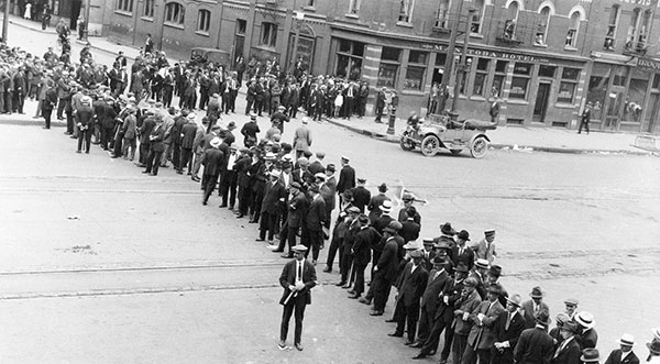 Special constables assemble at the corner of Market Avenue and Main Street, 21 June 1919.