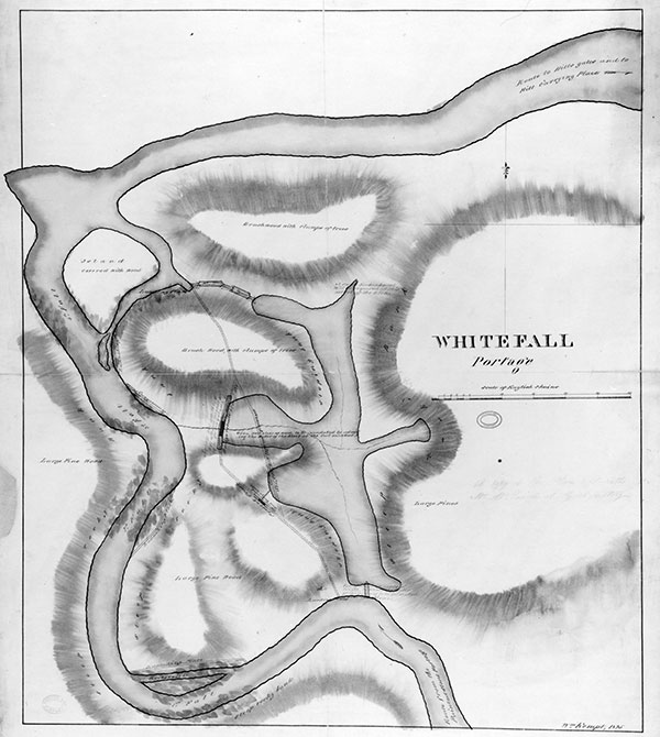 As the Hudson’s Bay Company’s main gateway into Rupert’s Land, York Factory was the entry point of goods and supplies destined for Lord Selkirk’s settlement at the junction of the Red and Assiniboine Rivers. As a result, the HBC needed to improve the water route from York Factory to the Red River Settlement. In 1824, surveyor William Kempt was hired by the HBC to do this. This map shows Kempt’s suggested changes to the route at White Fall Portage, situated on the Hayes River between Robinson and Logan Lakes. Some of these improvements were completed by Kempt and his crew.