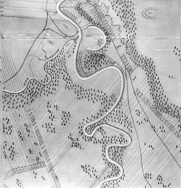 This portion of a cadastral plan of the Red River Settlement was created in 1838 by George Taylor Jr., HBC surveyor to the settlement. A cadastral plan is used to define land boundaries and land units to determine land titles. Taylor’s plan shows survey characteristics that shaped the Red River Settlement, such as two-mile (approximately three kilometres) long lots with an additional two miles of pasture, which were recognized by the federal government in The Manitoba Act establishing the Province of Manitoba. At the junction of the Red and Assiniboine Rivers, the lots were generally shorter as they ran into each other at the junction. Although the Red River Settlement was resurveyed by Dominion of Canada surveyors in the 1870s, Taylor’s system and pattern still form the basis for Winnipeg’s legal land descriptions.