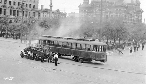 “A streetcar named anger.” On 21 June 1919, in the aftermath of an iconic photo of the Winnipeg General Strike, firemen mop up after a crowd tried to tip over a city streetcar.