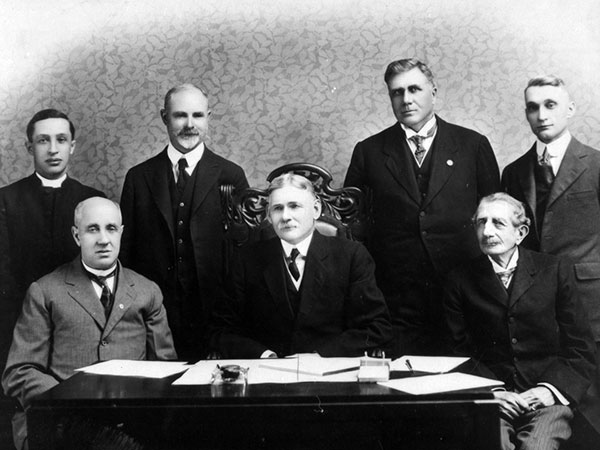 The Provisional Advisory Board and staff of the Winnipeg Foundation, 1921, included (left to right): Anglican cleric Robert B. McElheran, Winnipeg mayor and baker Edward Parnell, solicitor Charles P. Wilson, judge Thomas G. Mathers, judge Robert M. Dennistoun, judge Hugh J. Macdonald, and secretary Peter Lowe.