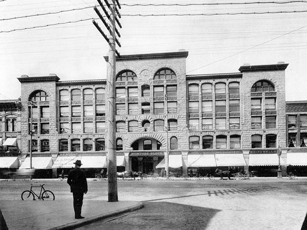 McIntyre Block, location for the office of the Winnipeg Foundation on the west side of Main Street from 1930 to 1949, as it looked in 1900. It was demolished in 1979 and replaced with a parking lot.