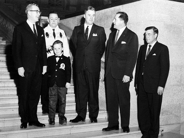 “Timmy” Wiebe, representative of children with disabilities for the 1965 Manitoba Easter Seals campaign, clasps the hand of Premier Duff Roblin on the steps of the grand staircase at the Manitoba Legislature. Behind Timmy is his father, David Wiebe, and to the right are S. C. Millett, Easter Seal Campaign Chairman, Opposition leader Gildas Molgat, and NDP leader Russell Paulley.