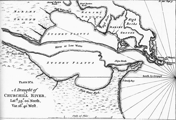 Joseph Robson was a mason and surveyor who worked at both Prince of Wales Fort and York Fort in the 1730s and 1740s. This map of the mouth of the Churchill River is from his 1752 book attacking his former employers, the HBC.