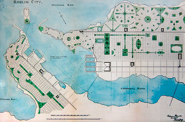 The vision. William Bruce’s 1912 map of Roblin City was replete with gardens, artificial lakes, streetcar lines on both sides of the Churchill River, with Prince of Wales Fort isolated on an island at the mouth of the harbour.