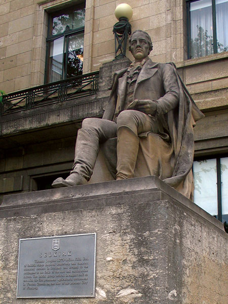 Thomas Douglas (1771–1820), Fifth Earl of Selkirk, guards the east entrance to the Manitoba Legislative Building. It is one of several commemorations of Selkirk and his settlers in Manitoba.