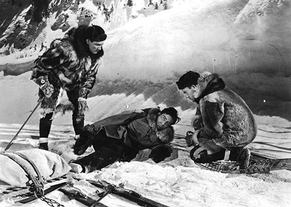 Geography is not Northern Pursuit’s strong suit. It begins with a map of the entire north of Canada where Hudson Bay is prominently displayed, but no ports or landfalls are indicated. Somewhere in the vicinity of Churchill—we must assume—a German U-boat breaks through thick ice to deposit a quintet of Nazi airmen on shore, each attired in a fur parka and carrying nothing except a rifle, back-pack and a pair of skis. Their leader is Major Hugo von Keller (Helmut Dantine), an ace Luftwaffe bomber pilot who, as we soon discover, is a quintessential representative of the Master Race, at once calculating, humourless and ruthless. We are not yet privy to their assignment but it involves trekking southwards to meet up with a local band of First Nation Canadians who will guide them to their final destination. The scenic landscape they traverse is magnificent. Mountains soar to ten thousand feet or more and trees over one hundred feet tall dot the landscape. This would come as no surprise to those privy to Warner Brothers production notes that indicate all exterior photography was done in and around Sun Valley, Idaho, whose topography is markedly different from Manitoba’s. Once the party encounters a mythical Bear Mountain, two of the Indian guides refuse to proceed over its pass, citing a distinct avalanche danger. Von Keller now reveals his true colours by casually ordering them shot in the back for insubordination. But their premonition of disaster proves only too true when the entire company, with the exception of the Major, is buried alive by a massive cascade of rock and snow from one of those lofty peaks. Left on his own, he struggles through the snow before collapsing.