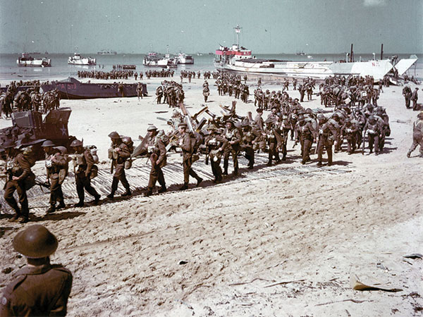 Canadian troops disembark from landing craft in an orderly manner onto the beachhead at Normandy, June 1944.
