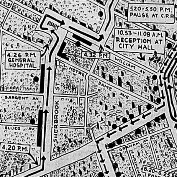 Map of the royal procession route along Sherbrook Avenue. Black bars indicate location of school groups, and black dots represent first-aid stations. Cecil Rhodes students were assigned to the west side of Sherbrook between Notre Dame Avenue and Sargent Avenue.