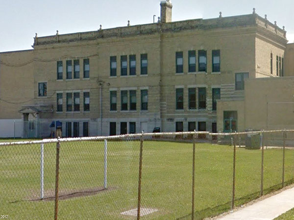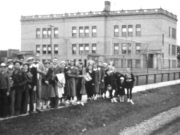 Cecil Rhodes students standing on William Avenue West, behind the original Cecil Rhodes School No. 1.