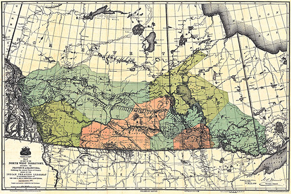 Source: Johnston, J. Map of Part of the North West Territory Including the Province of Manitoba Exhibiting the several Tracts of Country Ceded by the Indian Treaties 1,2,3,4,5,6 and 7. To accompany report of the Honorable Minister of the Interior dated 30th June, 1877 [map]. 1:2,217,600. [Ottawa]: Canada Dept. of the Interior Dominion Lands Branch, 1875.