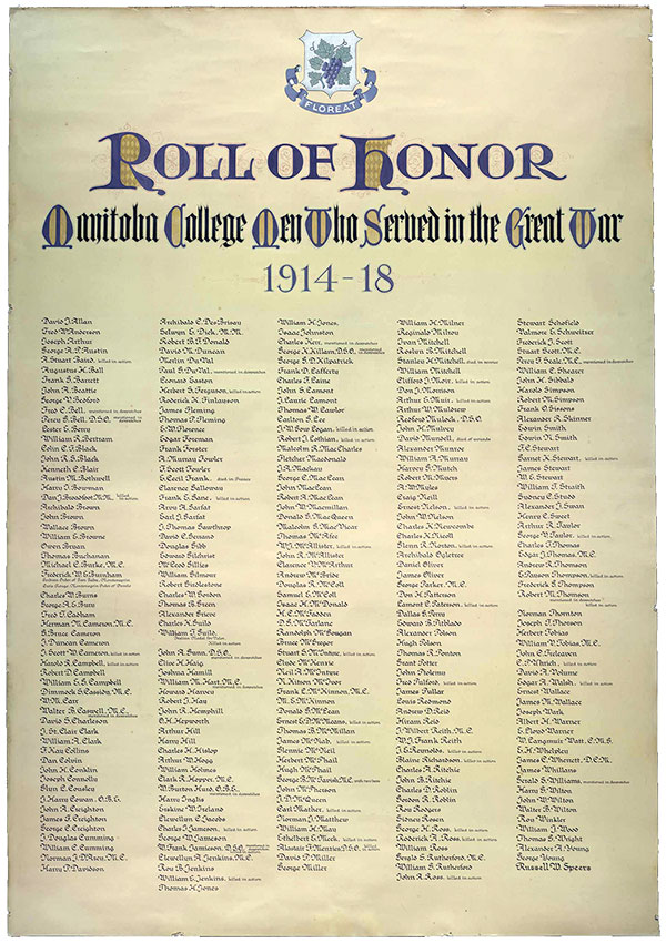 Prominently displayed in the University of Winnipeg Archives are reproductions of three beautiful and ornate rolls of honour that were created in commemoration of soldiers who fought and died for our freedom during the First and Second world wars. Two of these memorials contain the names of the former students, staff, and faculty of Wesley College and Manitoba College—the two predecessor colleges of the University of Winnipeg—who served in the First World War. The third roll of honour lists the names of those who attended United College—the amalgamation of Manitoba and Wesley colleges and direct antecedent of the University—and were killed in action during the Second World War.