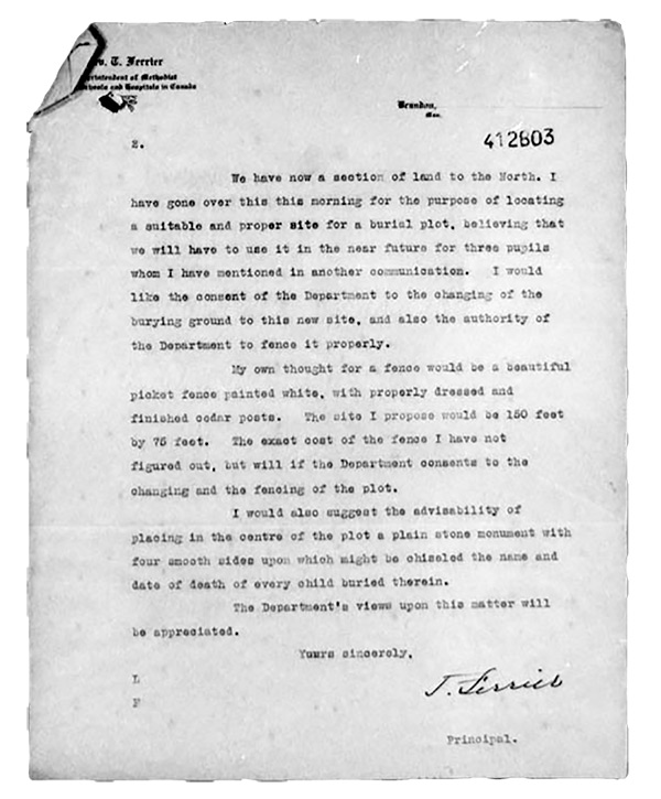 On 29 May 1912, Rev. Thompson Ferrier, Principal of the Brandon Residential School, wrote to the Secretary of the Department of Indian Affairs at Ottawa to propose the establishment of a new cemetery for children who died at the school. It would replace the previous burial ground beside the Assiniboine River that the City of Brandon was proposing to develop as a park. Ferrier noted that