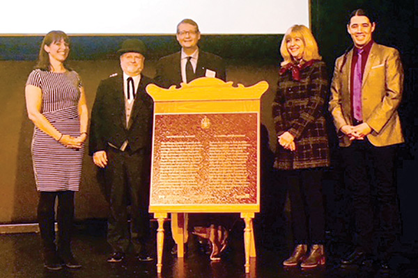 On 15 January 2018, a plaque recognizing the national historic significance of Winnipeg’s Metropolitan Theatre was unveiled (L-R) by Lea Ledohowski (President, CanadInns), Greg Agnew (Heritage Winnipeg), Rick Wishart (HSMBC), MLA Cathy Cox, and MP Robert Falcon-Ouellette.