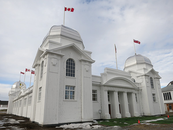 When Brandon was selected for the Dominion Exhibition’s location in 1913, the local agricultural association set about creating a permanent park. Several new buildings were constructed, including Dominion Exhibition Display Building No. 2. Meant to serve as a display hall, this single-storey building had an open plan with large windows to provide natural light. Its exterior is showy and grand, reflecting Beaux-Arts principles of design. Painted white to give the appearance of stone, its rectangular form is firmly anchored by large corner pavilions and prominent classical porticos centrally located on the principal facades.