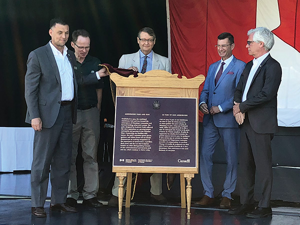 On 29 June 2018, a plaque recognizing the Assiniboine Park and Zoo as a place of national historic significance was unveiled (LR) by Bruce Keats (Assiniboine Park), Elvis Riou (Parks Canada), Rick Wishart (HSMBC), MP Doug Eyolfson, and MP Jim Carr.