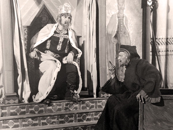 Winston McQuillan as Henry IV and George Waight as Dr. Genoni in Henry IV. In the right background FitzGerald’s Henry IV, 1928, oil on canvas, 186 x 116 cm (location unknown).