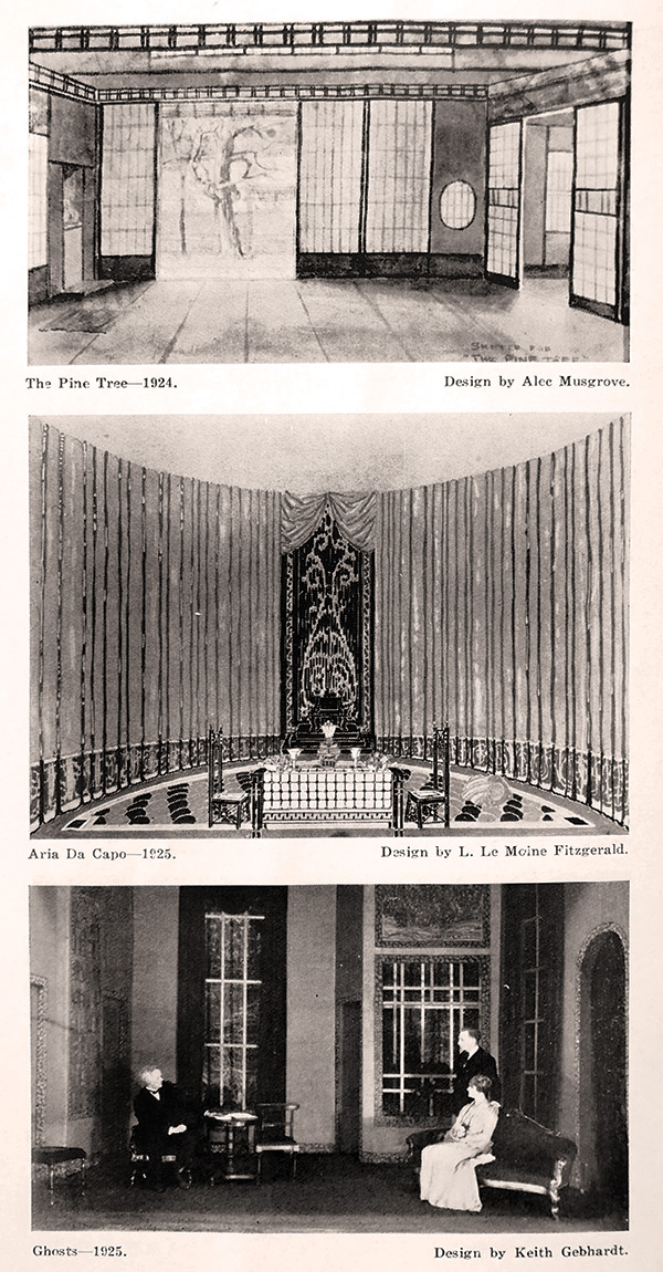 The most likely catalyst for FitzGerald’s association with the amateur theatre in Winnipeg was Edith Sinclair (1883–1945).[6] Sinclair would produce or direct most of the plays with sets designed by FitzGerald starting with the February 1925 production of Aria da Capo written by Edna St. Vincent Millay. The only visual document of FitzGerald’s set for this play is a reproduction of a drawing that was published in the Community Players periodical The Bill along with set designs by artists Alex J. Musgrove and C. Keith Gebhardt for two other dramas.[7]