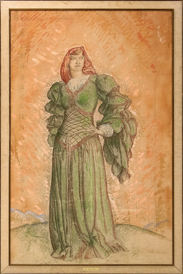 A photograph shows the cast of Henry IV in their costumes and medieval setting designed by FitzGerald. Seated foreground right is Robert Ayre in his role as The Old Servant. Flanking the throne centre stage are two large framed pictures. Although these are barely visible, they may be identified as FitzGerald’s paintings of the characters Donna Matilda Spina (left) and Henry IV (right). The painting of Donna Matilda Spina (now titled Lady in Green in the collection of the Musée d’art de Joliette) was worked up from a preparatory drawing (inscribed ‘Matilda’ lower right) squared for transfer. This drawing would have been consulted by members of the Costume Committee responsible for making the outfit.[17] Likewise a squared-for transfer preparatory drawing was made as the study for the large pendant painting of Henry IV (location unknown). The figure in the drawing conforms in every detail to the pose and costume of the King in the painting—seen best in the background of a publicity still. Although FitzGerald marked the drawing ‘Dinolli’ suggesting it was for the costume of the character the Marquis Charles di Nolli, it is evident that the design was to serve for both di Nolli and Henry IV, whose disembodied, bearded and crowned head was sketched by FitzGerald at the right of the sheet.