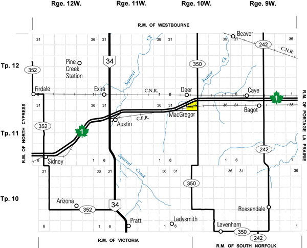 Arizona, Austin, Bagot, Beaver, Caye, Deer, Dock, Exira, Firdale, Hugo, Ladysmith, MacGregor, Pine Creek Station, Pratt, Rossendale, Sidney, Youill