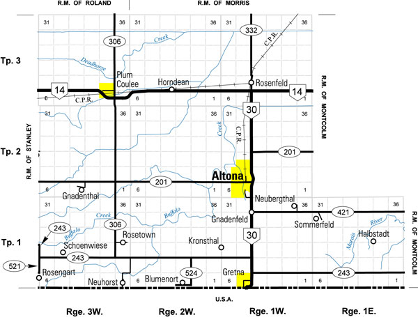 Altbergthal, Altona, Bergfeld (west), Bergman, Blumengart (west), Blumengart Colony, Blumenhof (west), Blumenort South, Ebenfeld (west), Edenburg, Edenthal, Eigengrund (west), Eigenhoff, Gnadenfeld, Gnadenthal, Gretna, Gruenfeld (west), Halbstadt, Hamburg (west), Heuboden (west), Horndean, Kleefeld (west), Kronsthal (west), Lichtfeld, Neuanlage (west), Neubergthal, Neuendorf, Neuhoffnung (west), Neuhorst, Plum Coulee, Reinthal, Rosenfeld, Rosengart (west), Rosenhof, Rosetown, Rudnerweide, Schoenau (west), Schoenhorst (west), Schoenthal (west), Schoenwiese (west), Silberfeld (west), Sommerfeld