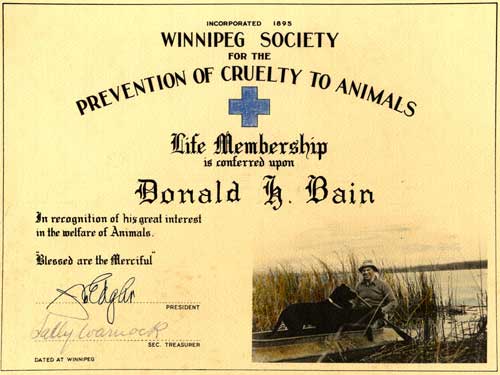 Life membership in the Winnipeg Humane Society awarded to sportsman Donald H. Bain, circa 1950.