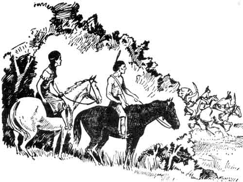 The bridegroom ran with his bride to the tethered horses, helped her mount the white steed, jumped to the grey in a flash and they were off. Westward they flew, but not unobserved. The Sioux with his party was quickly in pursuit.