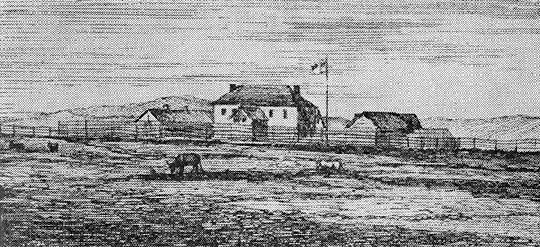 Fort Ellice—1862; this was the birthplace of James McKay. It was situated at a point on the level of the prairie where the deep and picturesque valley of the Beaver Creek joined the broad valley of the Assiniboine River, which could be seen wending its way for miles to and fro in the park-like bottom lands to join the Red River at the “Forks” by which name Fort Garry was known throughout the great plains. Great spruce trees surrounded a square, in the rear of which stood a large house, the Hudson’s Bay Quarters. In the middle of the square was a fur press and a tall flag-staff, on which was the British ensign with the “H.B.C.” on the fly, and this was hoisted on Sundays, holidays and in honour of visitors.