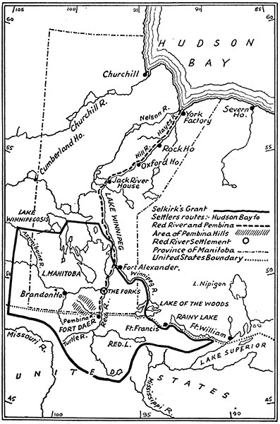 Map showing the grant to Lord Selkirk in 1811, and the route travelled by the early settlers from Hudson Bay to Red River and Fort Daer.