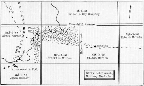 In her early recollections of Morden, Hannah McLain Curtis said, that on the day she was born in 1882, the Canadian Pacific Railway laid steel past her father's farmhouse. This site (4-3-5W) is now occupied by the Government of Canada Experimental Station. From this place the railway ran westward through Wilmot Morden's homestead. After that it veered slightly to the north, crossed Franklin Morden's homestead, then struck northwesterly through a farm owned by their father, Alvey Baker Morden. It then crossed Cheval Creek and climbed gently over the escarpment.