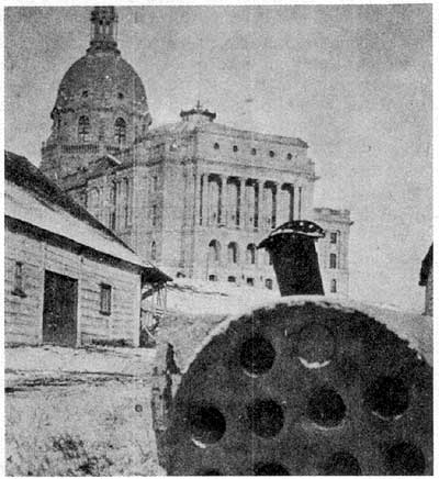 One of three boiler of the Northwest at Fort Edmonton: Alberta Legislative Building (1911) in background. The Northwest, built at Moorhead, Minnesota, 1881, by Peter McArthur; sold to HBC in 1883 and taken to Edmonton; wrecked by ice in 1886.