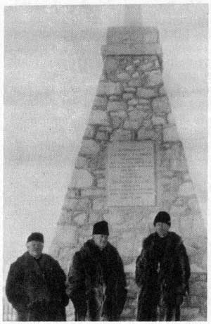 Monument erected in place of first wooden cross at first burial site of Fr. Darveau and companions. Situated 7½ miles from Duck Bay.