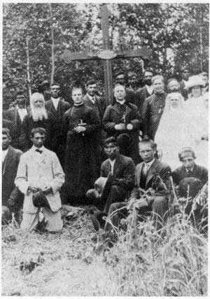 Wooden cross that originally marked the grave of Fr. Darveau at the spot his body was discovered and first entered. Centre row: Rev. C. J. Camper (Camperville named after him), Rev. Leonard Welpt, Archbishop Langevin, Rev. Provincial Cahill, Franciscan Sisters, with Fr. Joseph Chaumont behind them. Others are visitors and native parishioners.