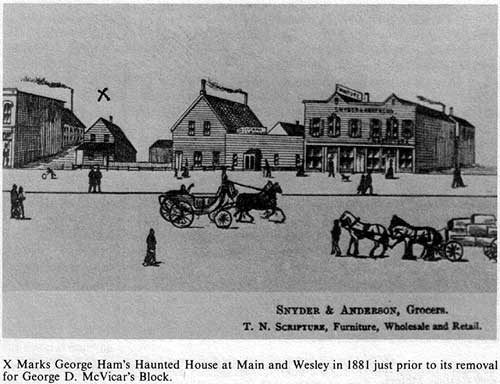 George Ham, in his book Reminiscences of a Raconteur related a somewhat jocular account of a haunted house he had inhabited from March, 1877 to November 1880. [1] The house stood immediately to the south of the first Grace Church [2] and somewhat to the north of Snyder and Anderson's wholesale grocery store. [3] The edifice had been probably built and first occupied by Captain George H. Young about 1874 or 1875. [4] Ham was the next tenant and appears to have been a witness to a number of "spectral events," such as a self-rattling stove, self-slamming doors and a self-flooding basement, that upon investigation, did not remain flooded. [5] However, as there was no real damage done, Ham decided to "live and let live" remaining there until November, 1880. At that time, Captain Young let the house to a cigar manufacturer named Conlisk. This latter person lasted about a month before the "visitations" became too odious. [6]