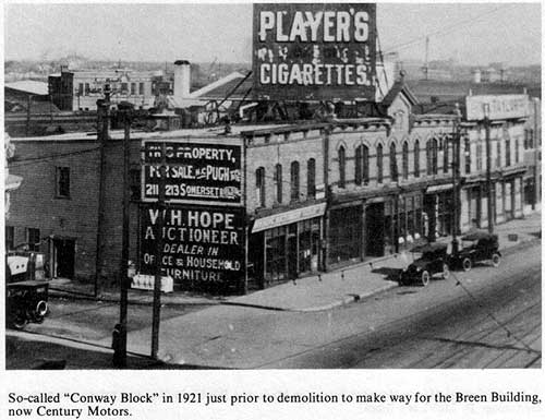 The scene now shifts from Winnipeg during the "crazy eighties" to that of Winnipeg in the "roaring twenties." The area to the south of Wesley Avenue on the east side of Main contained some of the oldest and most decrepit buildings in the city. Among these was the McVicar Block, subsequently renamed the Conway Block (for Michael Conway, a noted auctioneer) and latterly the Clinton Block. Since 1882, the number of this building had been 257-59 Main Street. During 1922, the Breen Motor Company purchased the two old tumble-down structures known as the Conway Block [12] and demolished the pair. While excavating for the foundations of the large three storey reinforced concrete edifice, a Slavic labourer made a gruesome discovery - four human skeletons. [13] The Provincial Coroner Dr. O'Connell took charge of the matter from that point and nothing further was heard on the topic.