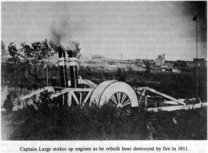 Captain Large opened a machine shop at 347-18th Street north on the left bank of the Snye River, which at that time had its confluence with the Assiniboiune about one eighth of a mile away. He worked on the craft and after some remodeling, it was put into use again in July 1910 as a Brandon Fair attraction.