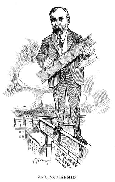 Born at Dunkeld, Perthshire, Scotland on 9 March 1855, he immigrated to Canada in April 1883 with his brother John McDiarmid. He moved to Winnipeg and, in 1884, became a partner with George White Murray in the construction firm of Murray and McDiarmid. In 1905, it became the James McDiarmid Company, General Builders and Contractors, with branches in Calgary and Vancouver. His firm built many different kind of structures, including grain elevators all over the prairies, and the Legislative Building after the cancellation of the original contract that had led to the fall of the Roblin government. McDiarmid designed many of the buildings himself, especially churches. He was also Vice-President of the Beaver Elevator Company.