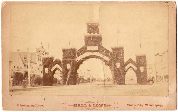 Victory arch on Main Street in Winnipeg, 1885 (front).