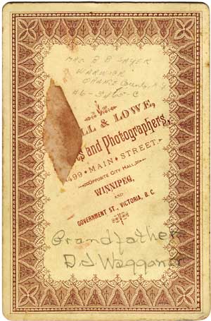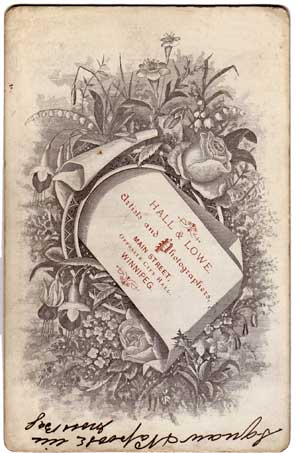 British Columbia would ultimately prove a draw for both men. Lowe had established a branch of their operation in Victoria by June 1885 [4]. Their Winnipeg studio was slightly damaged in a fire caused by the explosion of a photographic lamp [5], which may have instigated its closure the next year. Hall opened a new studio at Vancouver in October 1887 [6], and the partnership dissolved in May 1892, when Hall became the sheriff of Vancouver. Hall and Lowe lived out the remainders of their lives in British Columbia.