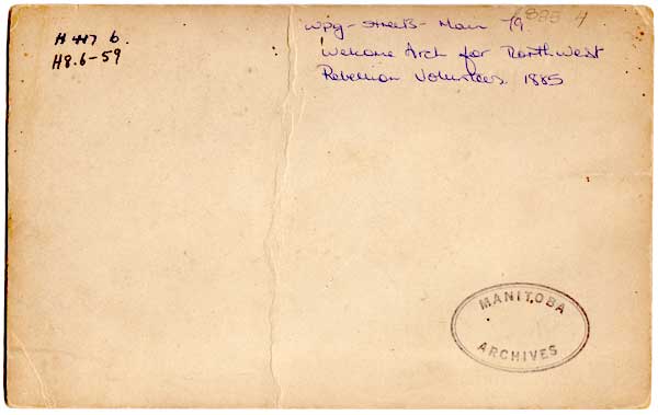 Victory arch on Main Street in Winnipeg, 1885 (back).