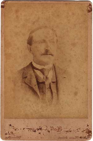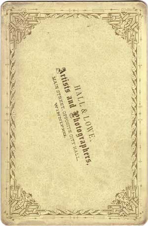 This rare view of Hall & Lowe’s studio at 499 Main Street, showing photographs hanging in the window, comes from the background of one of their cabinet cards, shown below in its entirety. Is that one of the proprietors standing in the doorway? We may never know because, at present, no photographs of either photographer have been found.