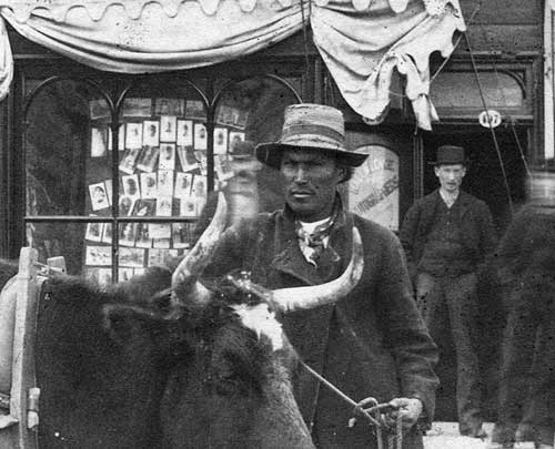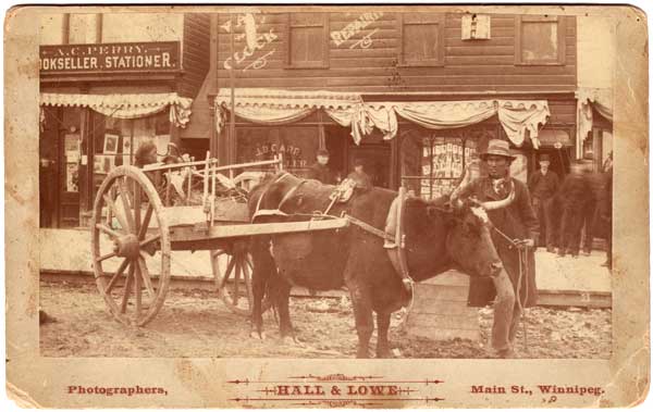 Ox-drawn Red River cart on the streets of Winnipeg, with the office of Hall & Lowe in the background (back).