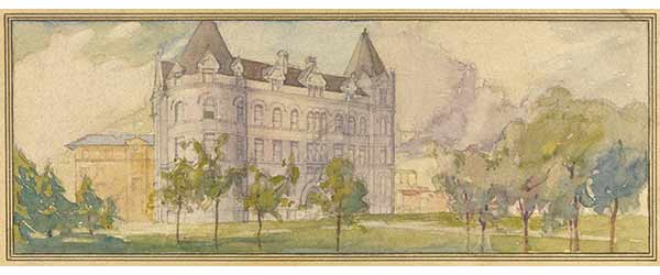 FitzGerald’s growing reputation as a designer of honour rolls led to more commissions during the War. His account book records that Wesley College (located on the present-day campus of the University of Winnipeg) paid $40 on 27 January 1917 for a roll of honour that would include the names of 300 men. An impressive unveiling ceremony was held on 13 February 1917 presided over by Sir James Aikins, Lieutenant-Governor of Manitoba. [16] FitzGerald’s design is a faithful watercolour rendition of the castle-like façade of the College built in the 19th century architectural style known as Richardsonian Romanesque after the architect Henry Hobson Richardson (1838-1886).
