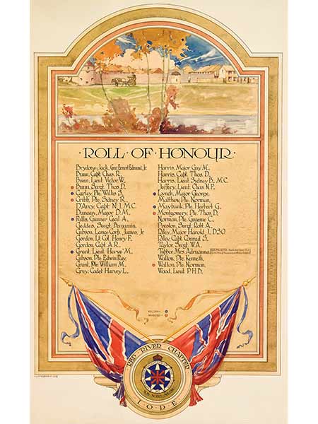 L. LeMoine FitzGerald, Imperial Order Daughters of the Empire (IODE, Red River Chapter) roll of honour, 1918. Ink and watercolour on paper, 75 x 47.1 cm, Winnipeg Art Gallery, Gift of the Red River Chapter of IODE, G-67-28