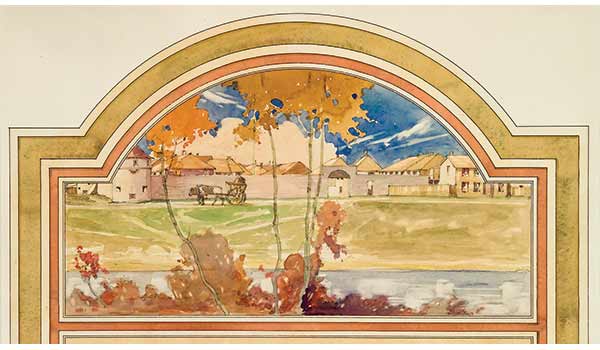 The specificity of place which marked the Wesley College commission was to inform another of FitzGerald’s most accomplished rolls of honour. On 16 January 1918, the artist was engaged for $20 by Richardson Brothers to make a scroll of honour for The Red River Chapter of the Imperial Order Daughters of the Empire (IODE). “The scroll, which has a painting in water colors of Upper Fort Garry across the top, lists thirty-four names of husbands and sons of charter members of the chapter and of a nursing sister who participated in or were killed or wounded during the First World War.” [17] In the lunette at the top of the scroll, FitzGerald painted a watercolour of Fort Garry likely based on a 1910 colourized postcard that reproduced an 1860 photograph. The artist departed from his model by adding a figure driving a Red River ox cart in the middle ground and by embellishing the foreground with a decorative landscape.