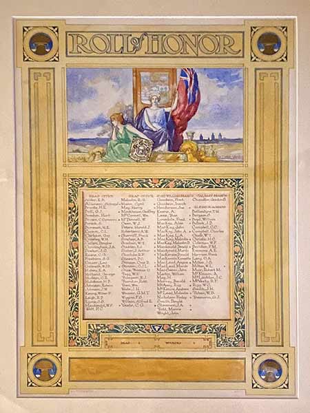 Almost every commission that FitzGerald received to design either an honour roll or add names came through Richardson Brothers or Russell-Lang and Company. Arthur John Richardson (1876-1959) and his brother Howard N. Richardson operated as art dealers and framers for forty years on Portage Avenue. Lisgar Lorne Lang (1871-1939) and W. D. Russell, whose bookstore was also located on Portage, were prominent publishers, stationers and distributors of printed material. According to FitzGerald’s account book, these businesses were two of his most prominent conduits of freelance commercial work during the War years. A survey of the account book reveals at least 133 commissions for honour rolls and related lettering between 1915 and 1920. [18] Yet as of this writing, a total of only five honour rolls signed by FitzGerald and four more unsigned are known to have survived. One hopes that more are yet to be discovered hiding away in archives or in the collections of those institutions such as churches, schools, civic groups, law firms and banks for whom they were made.