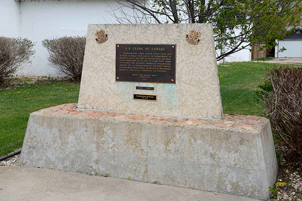 On 12 May 1963, this stone monument near the municipal office in Roland was unveiled by the Historic Sites Advisory Board of Manitoba at a ceremony attended by 4H President J. R. Racine, Reeve Albert E. Wakely, Agriculture Minister George Henry Wilson Hutton, D. B. Young of the Canada Department of Agriculture, Carol Preston, Ross Richard, J. D. Moore, Mrs. E. Ward Jones, J. D. Graham, and Mrs. James Byers. It commemorates the establishment at Roland, in 1913, of the first of Canada’s Boy’s and Girls’ Clubs, known since 1952 as 4-H Clubs.